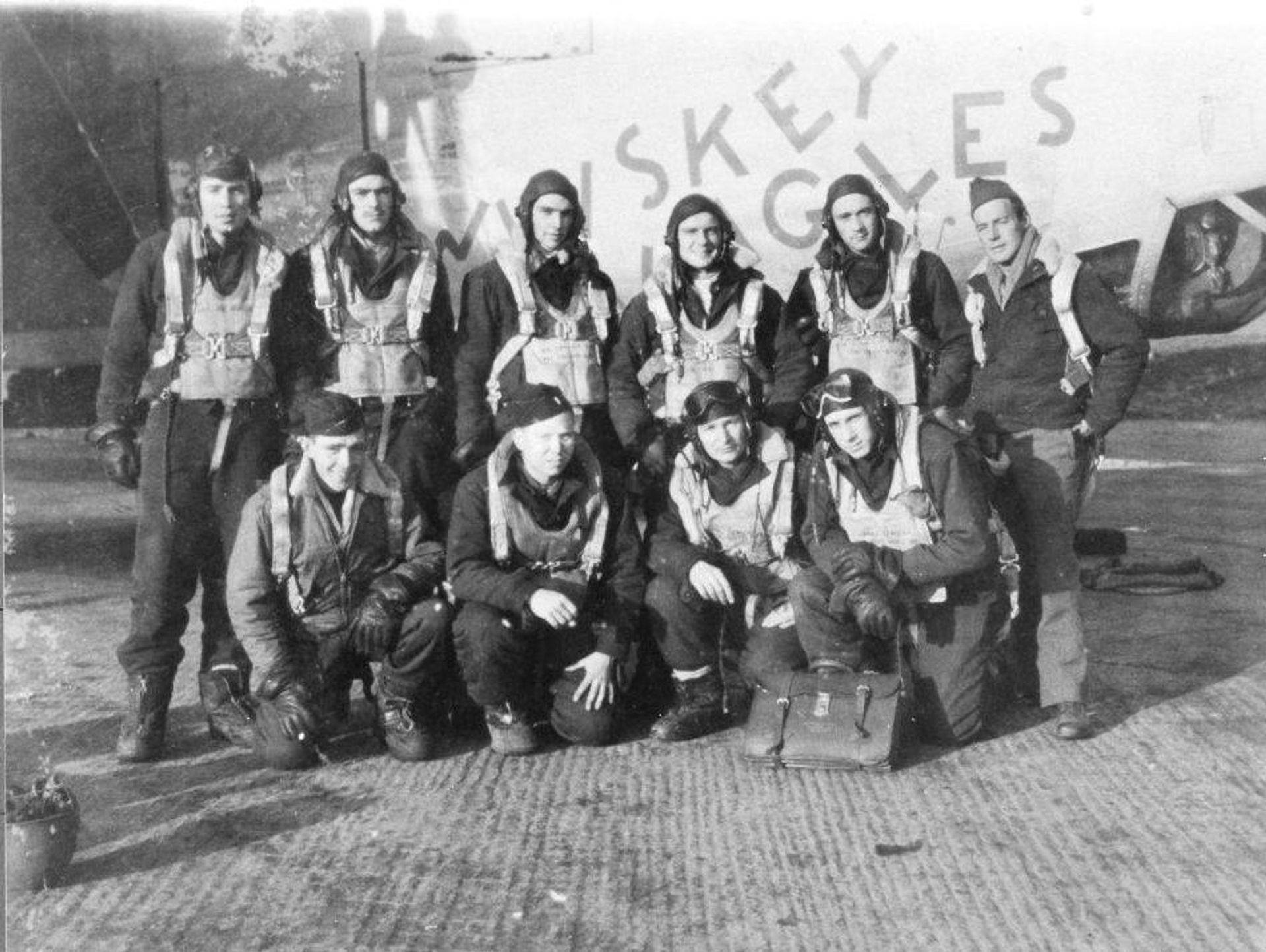 Jack Wilkins (standing, far left) with his crew and their B-24 bomber stationed in England. He was the tail gunner. His crew flew 28 missions, which was an incredible feat considering tail gunners during World War II had a survival rate of only 25 percent. Interestingly, the actor Jimmy Stewart was his base commander.